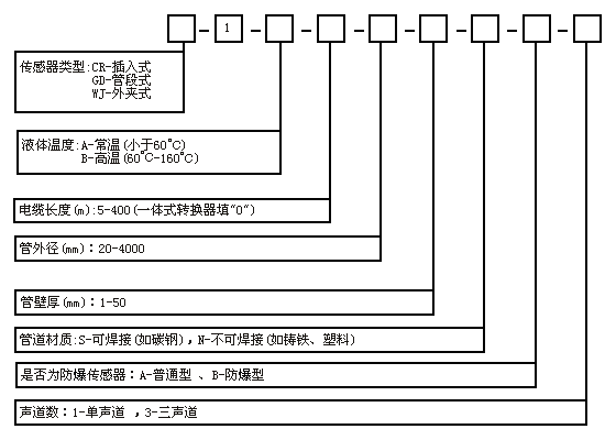 例如:選型外夾式單聲道傳感器,液體常溫,電纜長度15m,管外徑325mm,壁厚10mm,管道材 質(zhì)為鋼,非防爆。選型編碼為:WJ-1-A-15-325-10-S-A-1