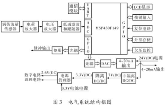 由于渦街流量計(jì)傳感器采用了壓電式渦街流量傳感器,所以信號變送器、流量計(jì)積算儀和渦街流量計(jì)的設(shè)計(jì)相同。由信號處理和流量積算儀組成的電氣系統(tǒng)結(jié)構(gòu)框圖如圖3所示。