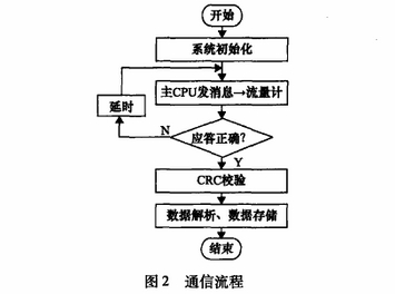 通信開始后,主機(jī)向總線上發(fā)送一幀消息,電磁流量計(jì)偵測(cè)總線狀態(tài)并接收主機(jī)送來的消息。如果消息中的地址與本站設(shè)備(即電磁流量計(jì))地址相符,而且計(jì)算所得的16位CRC校驗(yàn)碼也正確,就將收到的消息存儲(chǔ)在緩沖區(qū)內(nèi),接著執(zhí)行主機(jī)的命令,并根據(jù)處理結(jié)果返回一幀正確的消息作為對(duì)主機(jī)的響應(yīng),其通信流程如圖2所示。