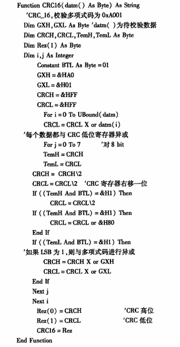 在Modbus標(biāo)準(zhǔn)通信中,對(duì)于即將被傳輸消息中的字符串必須進(jìn)行CRC校驗(yàn),目的是發(fā)現(xiàn)數(shù)據(jù)傳輸過程中可能出現(xiàn)的錯(cuò)誤。常用的校驗(yàn)多項(xiàng)式有CCITT和CRC-16,本系統(tǒng)采用CRC-16,其多項(xiàng)式為G(x)=xl6+xI5+x2+1,實(shí)際應(yīng)用時(shí)取其反序。