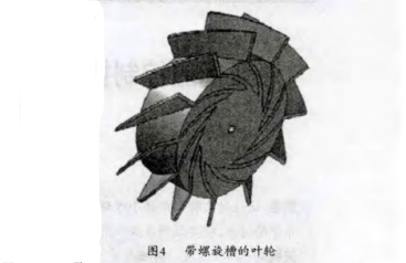 螺旋槽式泵人型氣體動(dòng)壓推力軸承是利用“窄槽理論",即假設(shè)在兩個(gè)運(yùn)動(dòng)副(一靜-動(dòng))其中的一個(gè)上面雕刻足夠多的窄槽,并且槽臺(tái)與槽之間間隙無(wú)限窄,再假設(shè)槽內(nèi)的氣體為不可壓縮氣體,當(dāng)動(dòng)運(yùn)動(dòng)副轉(zhuǎn)動(dòng)時(shí)使得槽內(nèi)的氣體向槽的中心匯集,槽內(nèi)氣體壓力升高,達(dá)到所需要的支撐力。根據(jù)這一一現(xiàn)象,我們把這種設(shè)計(jì)與流量計(jì)的葉輪相結(jié)合,設(shè)計(jì)出一種能夠產(chǎn)生承載力的葉輪(圖4),平衡葉輪所受的推力,達(dá)到降低流量計(jì)固定軸承所受合力的目的。另外,螺旋槽式泵入型氣體動(dòng)壓推力軸承的承載力與轉(zhuǎn)速有著一定的聯(lián)系,隨著轉(zhuǎn)速的改變而改變,轉(zhuǎn)速高時(shí),承載力高,轉(zhuǎn)速低時(shí),承載力低,實(shí)現(xiàn)了推力自平衡的目的。