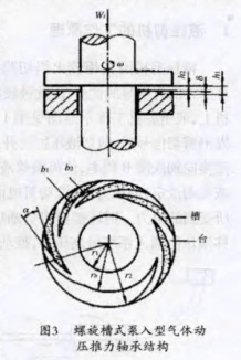 氣體渦輪流量計(jì)中軸承是在氣體潤(rùn)滑理論基礎(chǔ)上發(fā)展起來(lái)的種非接觸式軸承,與普通的滾動(dòng)軸承有著本質(zhì)上的區(qū)別,分為靜壓式氣體和動(dòng)壓式氣體軸承。靜壓式氣體軸承是利用外部供氣推動(dòng)氣體靜壓的承載部分,在兩個(gè)運(yùn)動(dòng)副之間產(chǎn)生間隙,達(dá)到無(wú)摩擦運(yùn)動(dòng)。動(dòng)壓式氣體軸承不需要外部供氣,而是利用其內(nèi)部的氣體,兩個(gè)運(yùn)動(dòng)副之間相對(duì)進(jìn)行轉(zhuǎn)動(dòng),依靠轉(zhuǎn)動(dòng)迫使運(yùn)動(dòng)副之間的氣體進(jìn)行壓縮,產(chǎn)生支撐承載部分的動(dòng)力,使兩個(gè)運(yùn)動(dòng)副之間產(chǎn)生間隙,達(dá)到支撐的目的。我們?cè)谶@里所引人的就是一種螺旋槽式泵人型氣體動(dòng)壓推力軸承的設(shè)計(jì)(圖3)。