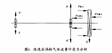 氣體渦輪流量計(jì)通過(guò)自身的調(diào)節(jié),依靠不同流量下葉輪轉(zhuǎn)動(dòng)的速度不同,產(chǎn)生不同的推力,通過(guò)這個(gè)推力,平衡垂直于葉輪端面的氣流推力(圖6),使得固定軸承在水平方向上所承受的F反推力有所降低,這樣大大改善了固定軸承的受力狀況,延長(zhǎng)軸承的使用壽命,并且由于軸承的摩擦力減小,軸承的運(yùn)轉(zhuǎn)精度得到進(jìn)-步提高,儀表的精度也會(huì)提高。