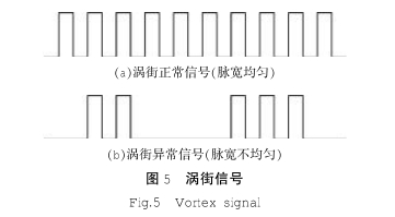 渦街流量計信號是由旋渦頻率數(shù)值來.體現(xiàn)的,在正常情況下,旋渦分離頻率是穩(wěn)定的,只有當傳感器發(fā)生異?;蚬r發(fā)生變化時,旋渦分離頻率才會有很大的變化,因此,通過觀察渦街流量傳感器頻率變化范圍的大小,可以很方便的分析出傳感器是否存在故障,不會出現(xiàn)模擬類傳感器在使用時因為零點偏移或模擬轉(zhuǎn)換誤差而帶來不易發(fā)現(xiàn)的計量誤差。渦街信號如圖5所示
