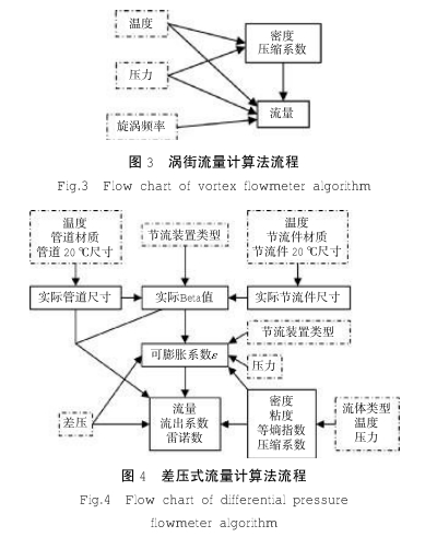 渦街流量計算法流程如圖3所示,圖中虛線框為外部采集信號,實線框為計算參數(shù);差壓式流量計算法流程如有圖4所示,圖中虛線框為外部信號及已知參數(shù),實線框為計算參數(shù)。