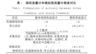 渦街流量計的旋渦分離頻率是與體積流量的大小成正比的,且分離頻率不受流體組分、密度、壓力溫度的影響。只要測量出旋渦個數(shù),就可以準確計算出體積流量,而旋渦個數(shù)的測量是純數(shù)字概念,不存在測量數(shù)值上的誤差,讓渦街流量計具有了全量程范圍內(nèi)流量信號精確的特點,是其它模擬類流量計不可比擬的優(yōu)點。傳感器線性均為18的脈沖型渦街和模擬類流量計精度對比如表1所示。