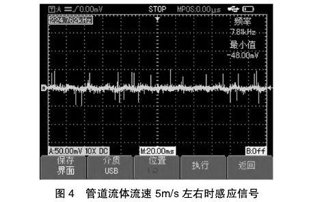 插入式電磁流量計(jì)零點(diǎn)漂移,傳輸信號(hào)線采用屏蔽線,確保儀表接地良好可大幅度減弱其影響;電化學(xué)干擾主要是電極表面的極化現(xiàn)象會(huì)造成插入式電磁流量計(jì)零點(diǎn)不穩(wěn),提高勵(lì)磁頻率可以減小其影響。觀察管道流體流速在5m/s左右時(shí)感應(yīng)信號(hào)(圖4),可以發(fā)現(xiàn)除去毛刺感應(yīng)信號(hào)幅值可達(dá)25mV,但其中有用信號(hào)的幅值在0.5mV左右,所以信號(hào)放大采集過程中要進(jìn)行濾波。參照勵(lì)磁方式,分析流速信號(hào)電壓的基本特征,以下從信號(hào)放大采集處理部分對(duì)流速信號(hào)能夠有效地、針對(duì)性地放大、處理和濾除雜波進(jìn)行分析。