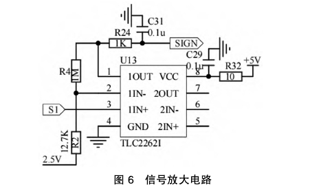 一款低成本、寬電源電壓范圍儀表放大器,該儀表放大器具有超高輸入阻抗、高共模抑制比、低噪聲、低線性誤差、低輸出阻抗的優(yōu)點(diǎn),查看芯片手冊(cè)可以得到。信號(hào)放大電路(圖6)采用運(yùn)算放大器TLC2262,TLC2262是TI公司雙路運(yùn)算放大器可以達(dá)到軌對(duì)軌輸出的性能,電阻R2、R4為精密電阻,確保放大倍數(shù)穩(wěn)定,R24和C31組成一個(gè)低通濾波器。
