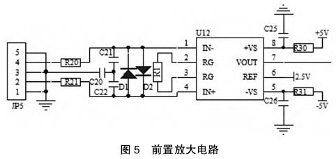 前置放大電路(圖5)采用儀表放大器進(jìn)行放大,儀表放大器前端是RFI濾波器,濾除衰減大部分干擾信號(hào),R1為精密電阻,確保放大倍數(shù)穩(wěn)定。二極管D1、D2可以限制輸入信號(hào)的大小,避免誤接線造成損壞。