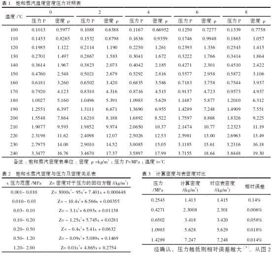 根據(jù)經(jīng)驗(yàn)公式,飽和水蒸汽密度與壓力及密度的關(guān)系(4)如表2。