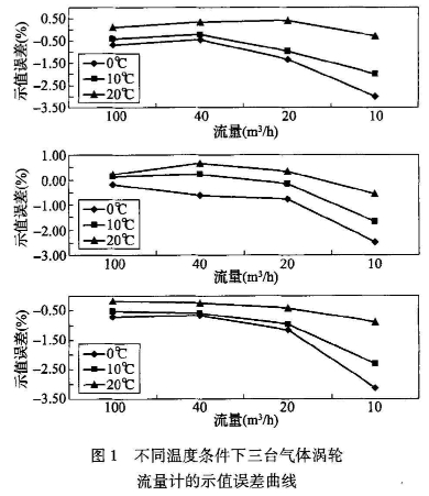 選取流量計(jì)中3臺(tái)較好的氣體渦輪流量計(jì)進(jìn)行環(huán)境影響性試驗(yàn),試驗(yàn)條件一:在20℃情況下充分恒溫,用鐘罩式氣體流量標(biāo)準(zhǔn)裝置檢測(cè);試驗(yàn)條件二:用高低溫試驗(yàn)箱恒溫至與音速噴嘴實(shí)驗(yàn)室溫度相同的溫度下,約10.5℃,用音速噴嘴式氣體流量標(biāo)準(zhǔn)裝置檢測(cè);試驗(yàn)條件三:用高低溫試驗(yàn)箱恒溫至0℃,控制音速噴嘴實(shí)驗(yàn)室溫度到0℃或略低于0℃,用音速噴嘴式氣體流量標(biāo)準(zhǔn)裝置檢測(cè)。不同溫度條件下三臺(tái)氣體渦輪流量計(jì)的示值誤差曲線如圖1所示。