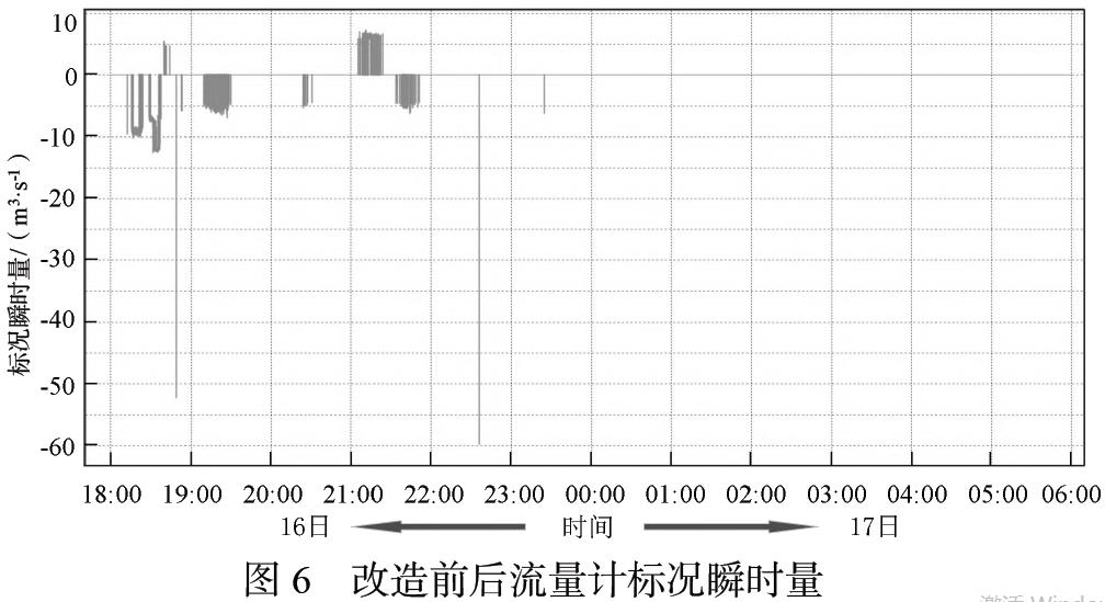 上述功能已在閩粵支干線揭陽分輸站完成測(cè)試,圖6為FT5201 停輸工況下,功能投用前后6h時(shí)段內(nèi),瞬時(shí)標(biāo)況流量與時(shí)間的關(guān)系圖,由圖6可知,投用前該路
