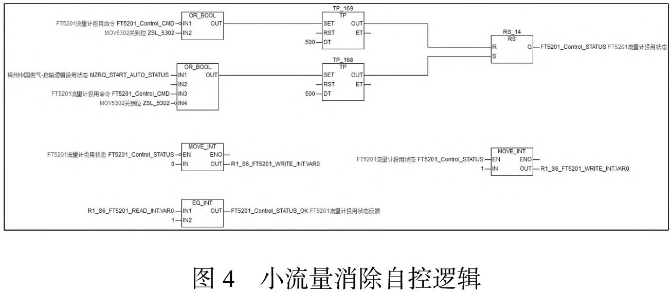為消除流量計(jì)停輸零點(diǎn)漂移導(dǎo)致流量計(jì)算機(jī)累計(jì)可能引發(fā)的計(jì)量歧義,采用Ensuite 軟件組態(tài)添加流量計(jì)算機(jī)計(jì)量啟??刂泣c(diǎn)位700,PLC 通過賦值給點(diǎn)位控制流量計(jì)算機(jī)啟停,如圖4 所示。圖4 在計(jì)量撬出口5302#閥門全關(guān)到位(ZSL_5302)分輸完成,500ms時(shí)段觸發(fā)流量計(jì)投用狀態(tài)(FT5201_Control_STATUS)并使流量計(jì)自動(dòng)停止計(jì)量(R1_S6_FT5201_WRITE_INT.VAR0), 停止計(jì)量的狀態(tài)通過PLC(FT5201_Control_STATUS_OK)采集反饋PCS 上位系統(tǒng),如圖5 所示,對(duì)應(yīng)指示燈變紅,也可通過上位機(jī)組態(tài)按鈕(FT5201_Control_CMD)手動(dòng)停止計(jì)量。值得一提的是閥門狀態(tài)反饋通常在投產(chǎn)前由廠家做好設(shè)定測(cè)試,因而出現(xiàn)閥位反饋錯(cuò)誤極端可能性較小,即使發(fā)生通道故障,由于全開/關(guān)到位為長(zhǎng)閉觸點(diǎn),閥門發(fā)聵中間態(tài),同樣可保證流量計(jì)算機(jī)處于投用計(jì)量狀態(tài);對(duì)于計(jì)量撬出口閥門內(nèi)漏的情形,當(dāng)前只能通過加強(qiáng)現(xiàn)場(chǎng)巡檢的方式,一旦發(fā)現(xiàn)Q.sonicplus 信號(hào)處理單元流量累計(jì)持續(xù)攀升,則應(yīng)手動(dòng)投用計(jì)量,并及時(shí)處理泄漏故障。
