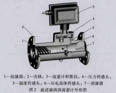 旋進(jìn)漩渦流量計(jì)主要由起旋器、文丘里管、消旋器和檢測(cè)元件組成。其結(jié)構(gòu)原理如圖1所示,外形如圖2所示,當(dāng)流體流進(jìn)旋進(jìn)漩渦流量計(jì)后,在起旋器的作用下,被" />