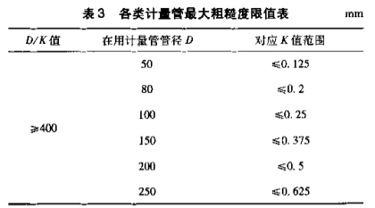 由于標(biāo)準(zhǔn)只對D/K≥400的情況提出了規(guī)定,因此現(xiàn)場在用的部分計(jì)量管是無法按實(shí)際粗糙度進(jìn)行修正的。就目前采用的積算軟件而言,K值最大也只能修正到D/K=400的情況,表3列出了氣田內(nèi)目前常用的幾種測量管可以進(jìn)行修正的粗糙度值。
