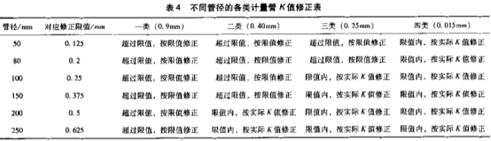 由此可得,川西氣田現(xiàn)用的粗糙度修正系數(shù)0.15mm不合理,應(yīng)依據(jù)計(jì)量管的實(shí)際粗糙度情況,并結(jié)合標(biāo)準(zhǔn)進(jìn)行取值。對沒有超過限值的按實(shí)際K值修正,對超過限值的,按最大限值進(jìn)行修正。下面(見表4)將給出不同管徑的各類計(jì)量管應(yīng)采用的修正值。