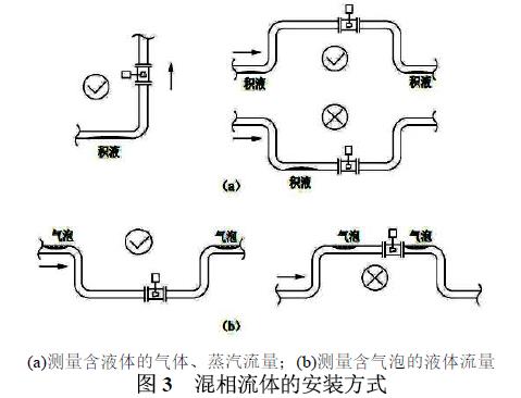 渦街流量計在管道上可以水平、垂直或傾斜安裝,但測量混相流體時,測量精度得不到保障,需保證測量流體充滿管道,避免產(chǎn)生混相流,根據(jù)混相流體的特點,選擇合適的安裝方式,具體的安裝方式如圖3 所示。
