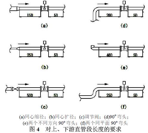 渦街流量計必須在穩(wěn)定的流束場內(nèi),有一定的直管段要求,直管的長度會影響精度,必須保證上、下游直管段有一定的長度,通常是上游直管段>10D,下游直管段>5D,還要結(jié)合現(xiàn)場安裝情況進(jìn)行調(diào)整,如果上游有彎頭或者閥門,直管段相應(yīng)的需要加長,具體的安裝要求如圖4 所示。