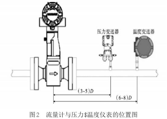 具體安裝實踐中對流量計前后直管段提出十分嚴(yán)格的要求,流量計上游要確保有10D~35D的直管段(D是管道直徑),下游直管段要≥5D,結(jié)合上游區(qū)域內(nèi)是否存有無直角彎、擴(kuò)大管、縮徑管等情況設(shè)定上游直管段的具體長度。在這里筆者重點提及的一點內(nèi)容是,當(dāng)直管段的安裝符合設(shè)計要求時,盡量將流量安裝在前后直管段偏大的管道.上,借此方式確保流量計上”下游節(jié)流件所形成的紊流不會降低測量結(jié)果的精準(zhǔn)度。結(jié)合實際流體測量的現(xiàn)實需求,需要在渦街流量計檢測壓力與溫度值,建議將測壓點、測溫點分別設(shè)定在傳感器下游的3D^5D、6D8D位置(圖2)。