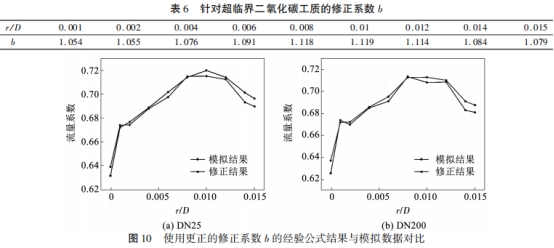 對(duì)DN25和DN200管道的模擬流量系數(shù)及經(jīng)驗(yàn)公式計(jì)算結(jié)果求平均,得到針對(duì)超臨界二氧化碳工質(zhì)的不同孔板邊緣尖銳度對(duì)應(yīng)的修正系數(shù)b,如表6所示。將更正的修正系數(shù)應(yīng)用于模擬數(shù)據(jù),結(jié)果如圖10所示。