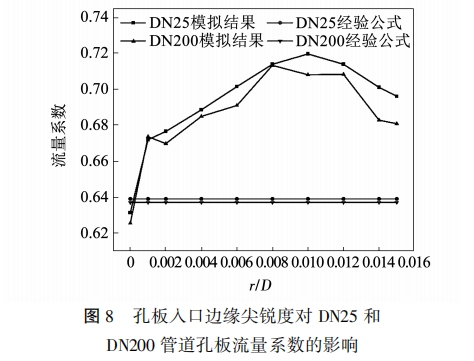 孔板流量計(jì)系數(shù)的影響趨勢(shì)與管徑無(wú)關(guān)。隨著孔板人口邊緣逐漸變鈍,DN25和DN200兩種管道的孔板流量系數(shù)呈現(xiàn)近似相同的變化趨勢(shì),均隨著人口圓弧半徑的增大而先增大后減小,分別在r達(dá)到0.01D和0.008D時(shí)流量系數(shù)達(dá)到最大;