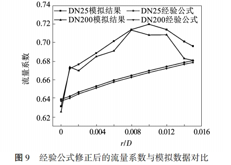 當(dāng)使用標(biāo)準(zhǔn)文件給出的不同邊緣尖銳度對(duì)應(yīng)的修正系數(shù)b進(jìn)行孔板流量系數(shù)的修正時(shí),可以--定程度上減少流量系數(shù)的相對(duì)誤差。本文使用表5中的修正系數(shù)b對(duì)經(jīng)驗(yàn)公式計(jì)算結(jié)果進(jìn)行修正,結(jié)果如圖9所示。