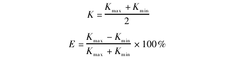 式中:K為平均流量系數(shù);E為渦輪流量計最大示值.誤差;Kmax為流量范圍內(nèi)各檢定點得到的系數(shù)中最大值;Kmix為流量范圍內(nèi)各檢定點得到的系數(shù)中最小值。
