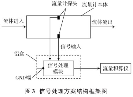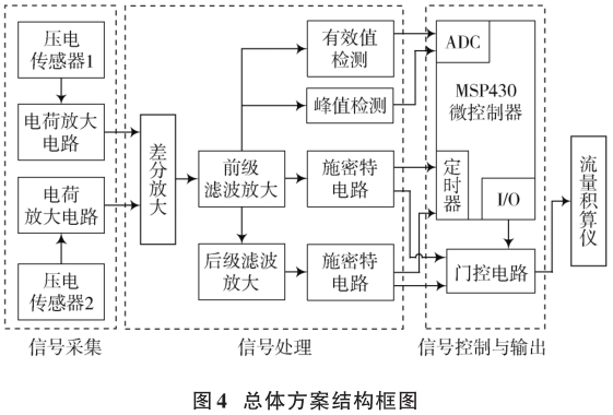 信號處理的設(shè)計方案如圖3所示。在旋進旋渦流量計內(nèi)部沿軸線對稱安裝傳感器,傳感器采集到包含流量和振動干擾信息的電信號,輸出至信號處理模塊;信號處理模塊置于鋁盒內(nèi),將電路的接地端與鋁盒相連,形成閉合回路,達到電磁屏蔽的目的。同時,在外置鋁盒上引出模塊的輸入端和輸出端,一方面接收傳感器的輸出信號,另一方面將包含流量信息的脈沖信號送入流量積算儀。流量積算儀顯示溫度、壓力等參數(shù),根據(jù)脈沖信號計算并顯示流量值。信號處理模塊采用MSP430FR5724微控制器為主控MCU,在此基礎(chǔ)上外圍電路設(shè)計了前置放大電路、多級濾波電路、有效值檢測電路、峰值檢測電路和信號整形電路。