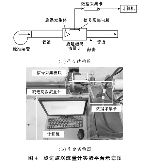 旋進旋渦流量計實驗平臺示意圖如圖4所示,主要由標準裝置、管道、PCle-6320數(shù)據(jù)采集卡、流量計信號采集電路和DN50氣體旋進旋渦流量計實驗樣機組成。