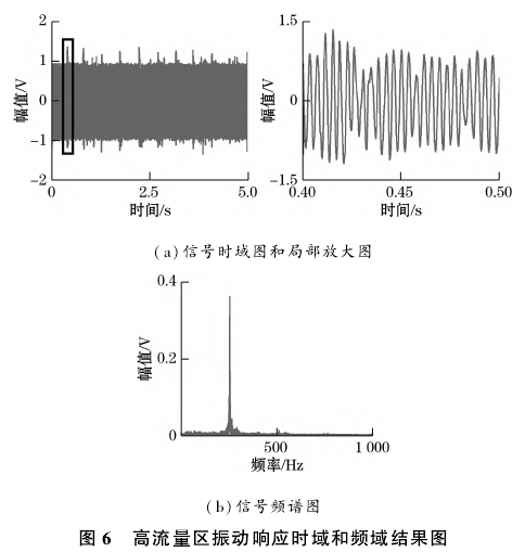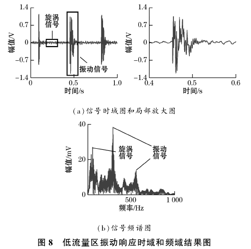 對實驗平臺的管道施加3~4Hz的敲擊振動,得到的時域與頻域結(jié)果如圖6所示。從結(jié)果可以看出,振動信號的初始峰值與旋渦信號的幅值基本一致,同時兩者的頻譜圖基本相同,計算得到的信號頻率值為257.1Hz,與穩(wěn)定狀態(tài)下的測量結(jié)果基本--致。因此,在高流量區(qū)由于旋渦信號本身的能量較大,疊加的振動信號不會影響旋渦頻率的測量結(jié)果,可以直接通過FFT分析獲得旋渦頻率。