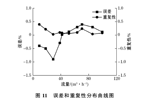測量誤差與重復性曲線如圖11所示,低流量區(qū)的最大測量誤差和重復性分別為-0.5%和0.4%,高流量區(qū)的最大測量誤差分別為-0.9%和0.24%,根據(jù)旋進旋渦流量計檢定規(guī)程要求,低流量區(qū)8~24m'/h最大允許誤差范圍為3.0%,重復性小于1.0%;高流量區(qū)24~120m3/h最大允許誤差范圍為1.5%,重復性小于0.5%。綜合以上分析,所有指標均在規(guī)定的范圍內(nèi),符合旋進旋渦流量計的性能要求。