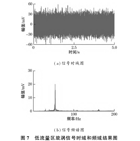 低流量區(qū)以流量點9.0m3/h的瞬時流量信號為例,采集得到的無振動情況下的旋渦信號的時域與頻譜圖如圖7所示,200Hz以上的信號分量基本為0,未在結(jié)果圖中展示。從結(jié)果可以看出,雖然存在一部分高頻噪聲,旋渦信號的幅值有跳動的情況,但仍然不會影響流量計的測量結(jié)果,同高流量區(qū)采用相同的方法計算信號頻率為54.0Hz。