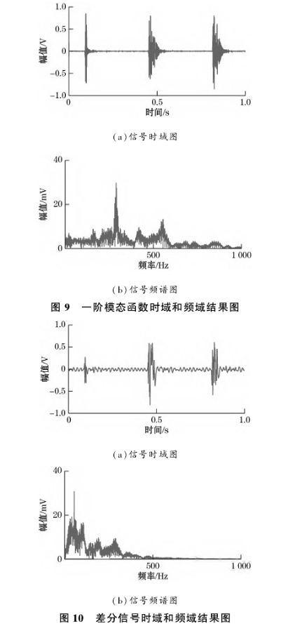 上述信號進行分解后得到的一階本征模態(tài)函數(shù)時域與頻域結(jié)果如圖9所示。從結(jié)果可以看出,EMD處理后得到的本征模態(tài)函數(shù)基本保留了原有振動信號的所有特征,幅值較大處對應的頻率基本--致。