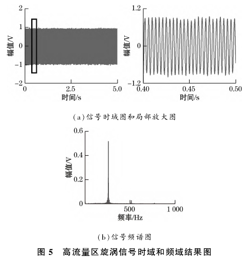 高流量區(qū)以流量點41.7m3/h的瞬時流量信號為例。在流量穩(wěn)定的情況下完成采集并去除信號中的直流分量并進行處理,由于對信號已進行低通濾波處理,頻譜分析得到的結(jié)果中1kHz以上的信號對應幅值基本為0,在圖中不做展示,得到的無振動情況下的旋渦信號的時域與頻域結(jié)果圖如圖5所示。從結(jié)果圖中均可以看出,旋渦信號近似于正弦信號,與理論分.析相符,信號頻率即為頻譜圖中尖峰對應的頻率,通過FFT計算得到結(jié)果為258.1Hz。