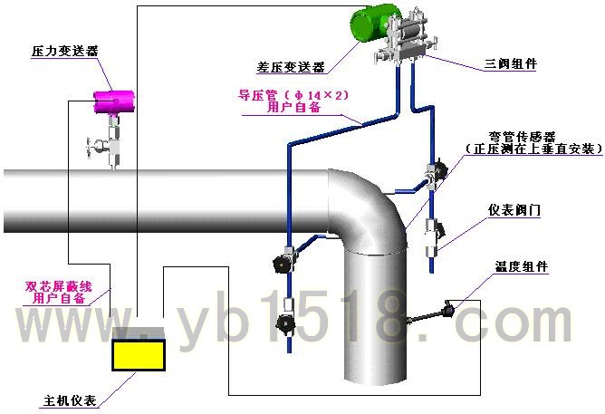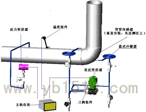 流體沿彎管弧形通道流動(dòng)時(shí),由于受到角加速度的作用,產(chǎn)生離心力,在彎管的內(nèi)外側(cè)管壁處產(chǎn)生差壓,配置差壓變送器,可由測(cè)差壓進(jìn)而得知流量值,產(chǎn)品應(yīng)用于惡劣的工" />