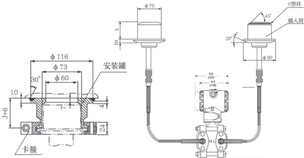 ② 遠(yuǎn)傳裝置的工作溫度,由所選擇的灌充液種類確定。 ③ 遠(yuǎn)傳差壓變送器的介質(zhì)溫度影響是指兩側(cè)的遠(yuǎn)傳裝置由室溫開始同時(shí)受到相同的溫度作用,所產(chǎn)生的輸出變化。 ④ 靜壓和溫度影響,均是在最大量程時(shí)測(cè)得。 ⑤ DP型遠(yuǎn)傳差壓變送器兩側(cè)的毛細(xì)管最大長(zhǎng)度為7.5米,兩側(cè)長(zhǎng)度差為4.5米。 平法蘭(RFW)遠(yuǎn)傳差壓變送器